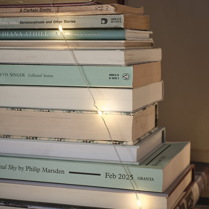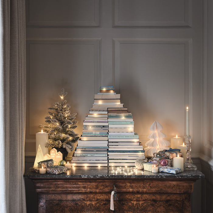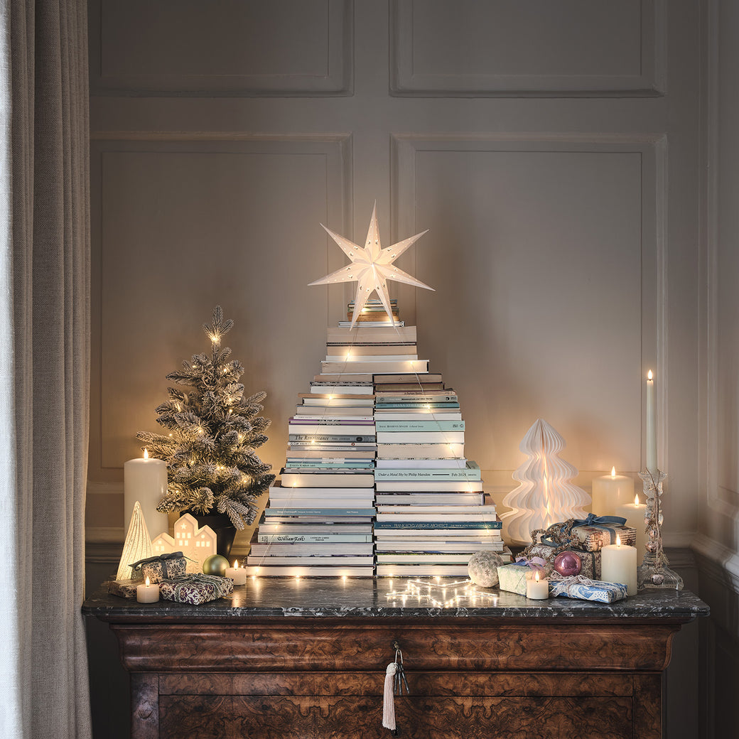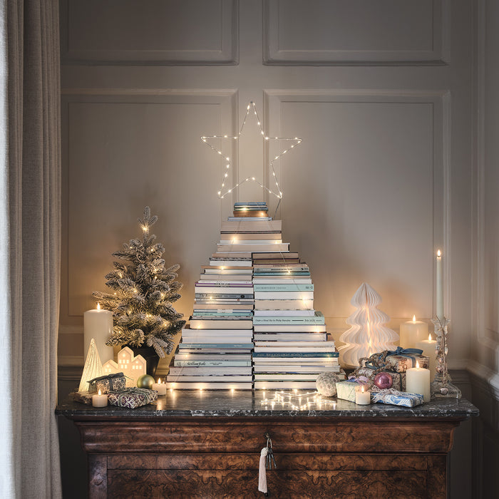 No tree is complete without a star! Using invisible fishing wire, suspend a light-up paper star above your book tree for an on-trend, Scandi feel, or choose a wire-framed Osby star for a classic finish. Alternatively, secure the star to the top of the stack or to the wall behind your display using white tack or double-sided tape, tucking the battery box out of sight behind the uppermost book, and choose the timer effect for automatic illumination every evening.