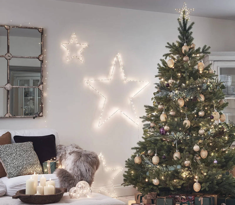 Choosing your Christmas tree lights creates the festive ambience in your home as the delicate glow fills your space with a magical glimmer of festive cheer. Multicoloured Christmas lights adds a playful and nostalgic feel to your home, white Christmas lights transforms your space into a soft snowy winter wonderland, and traditional warm white Christmas lights creates a cosy and inviting festive glow that fills your heart as your tree twinkles each evening. Begin to dress your Christmas tree from the top and intertwine the lights in a circular motion down to the base, making sure to weave them in between each branch. Keeping your Christmas tree lights switched on whilst putting them in place will ensure an even glow throughout.