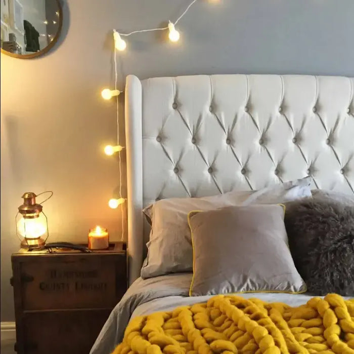 Bedroom fairy lights are the easiest accessory to display as they are quick to put up, can be placed almost anywhere for an instantly personalised feel. You can use fairy lights to adorn hung artwork, prints and photo frames as there lightweight design means they can be kept in place with a dot of bluetack. Their thin wire cable makes them super easy to wrap around bed frames, weave between shelf ornaments and even plants. To create a warm comforting glow to everyday objects.