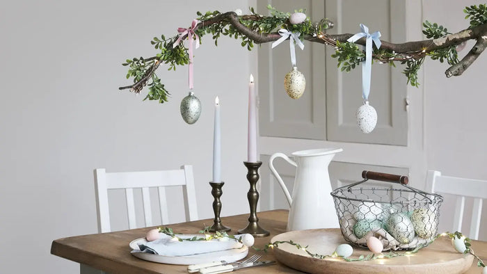 Compliment your DIY decoration by matching to your table! Dress place settings with LED candles in a mixture of pastel colours and sizes, and create a simple but effective dining table centrepieceby running an Easter garland down the middle.