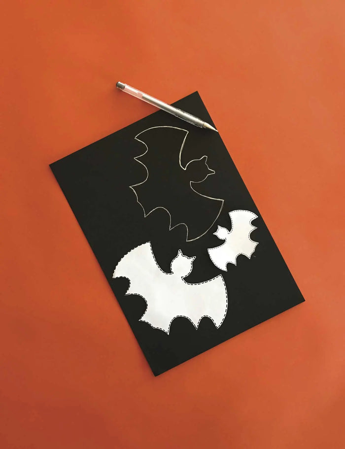 Cut out your bat stencils, place them on a piece of A4 black card, securing with a little blu tack if needed. Draw around each stencil then cut around the line you’ve just drawn. Repeat as many times as you want bats. Top tip - white chalk or a silver marker pen works best for drawing on the card.
