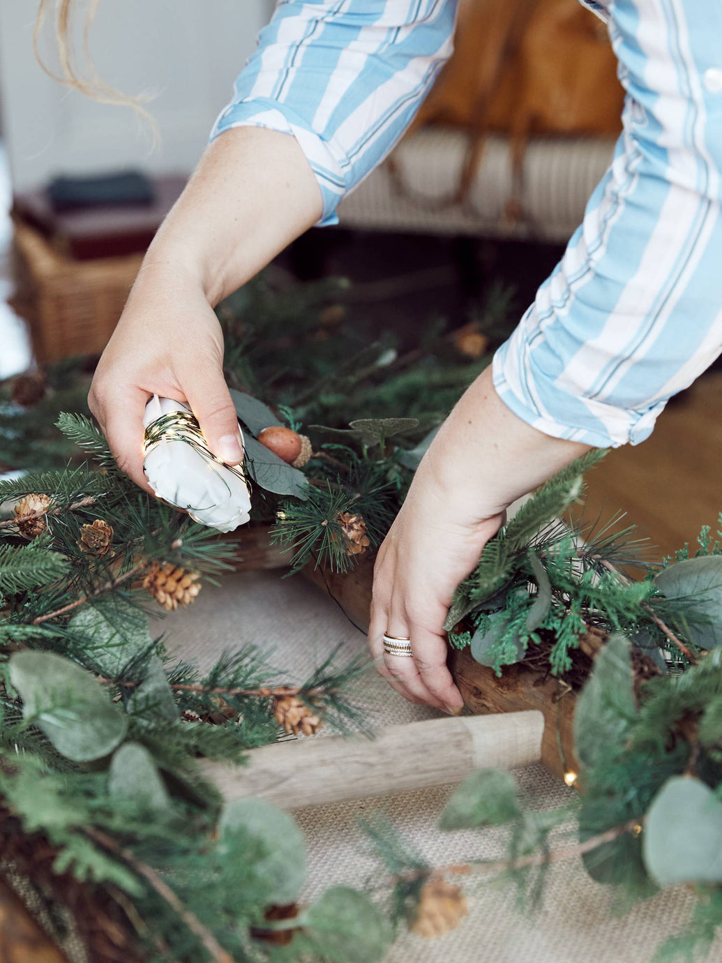 Start by lining up the ladder or branch with your garlands, ensuring that each garland is facing the same way before securing your garland along the side of the ladder with wire ties. Tease the foliage out as you go along for the perfect rustic finish.