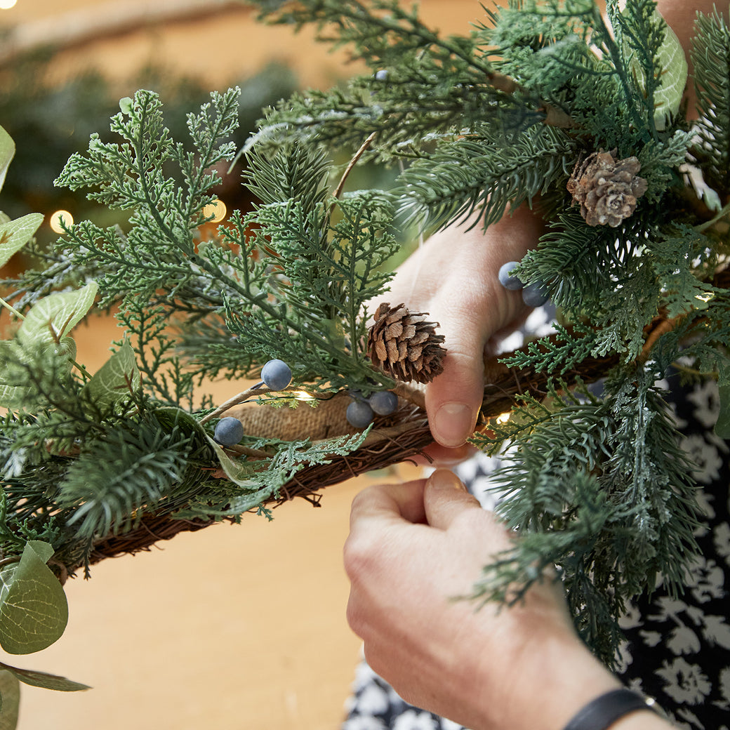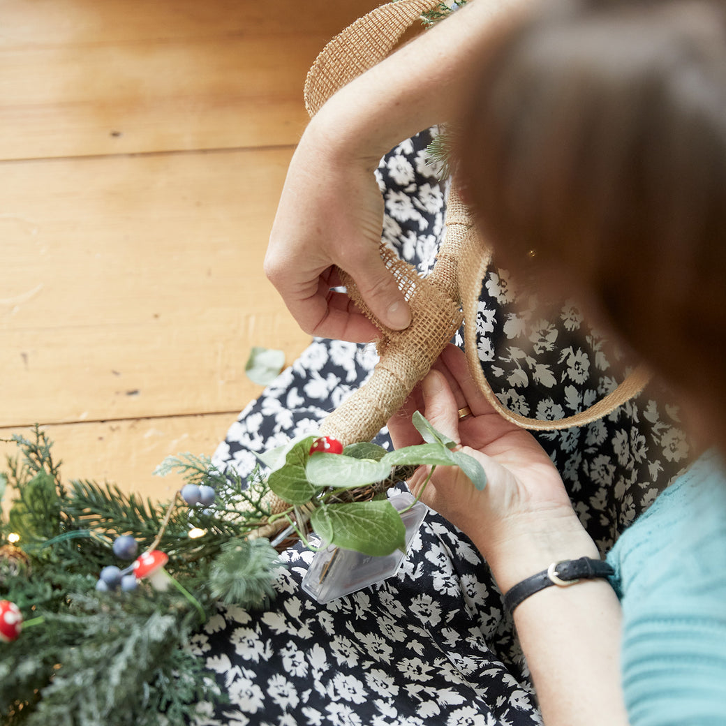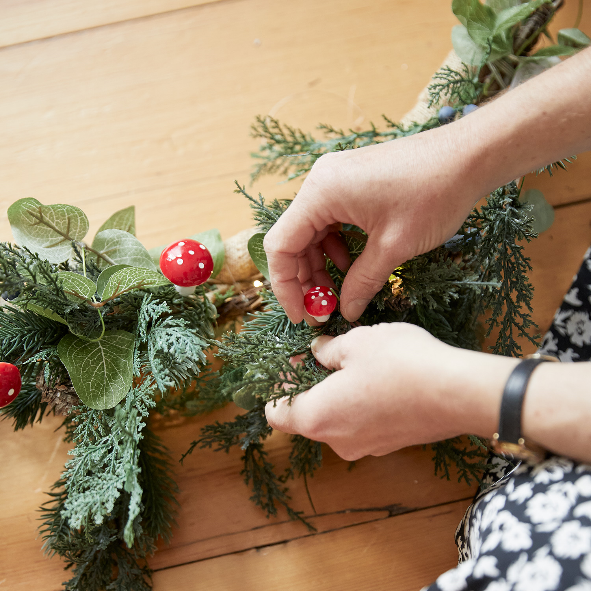 With the fiddliest part complete, add a festive touch with dainty decorations. For a pop of colour, add mushroom picks that create interest and add to the cottagecore, wild foliage look. Keep it simple with just a few scattered amongst the garlands or pack them in for a merry and vibrant appeal.