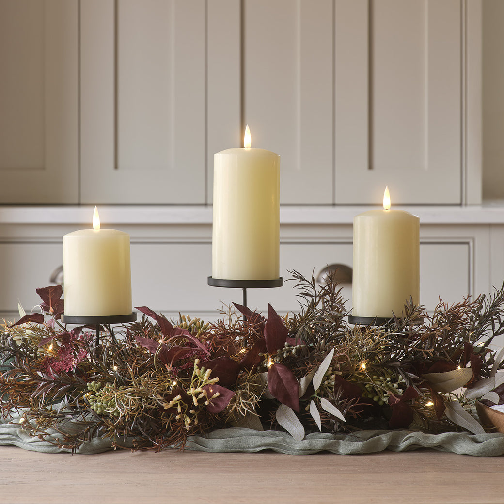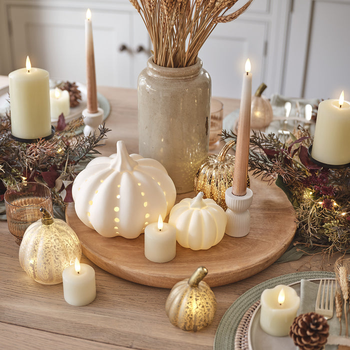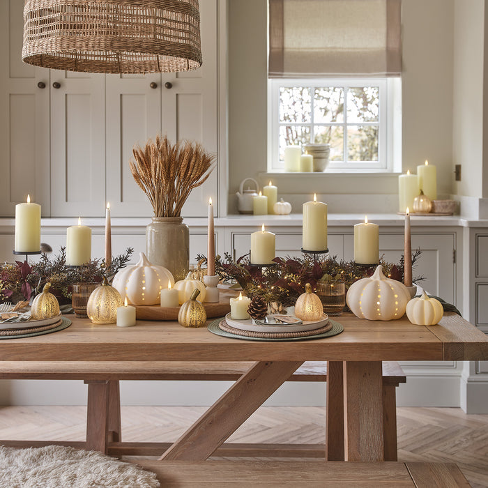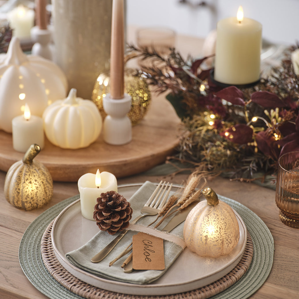Once the table is laid, it’s time to turn down the lights and turn up the autumn ambience. LED taper candles in simple stoneware holders provide some height, whilst clusters of illuminated pumpkins in varying shapes, sizes and finishes bring a golden glow to your display. Ivory pillar candles—dotted between the foliage and fall decorations—complete the cosiness.