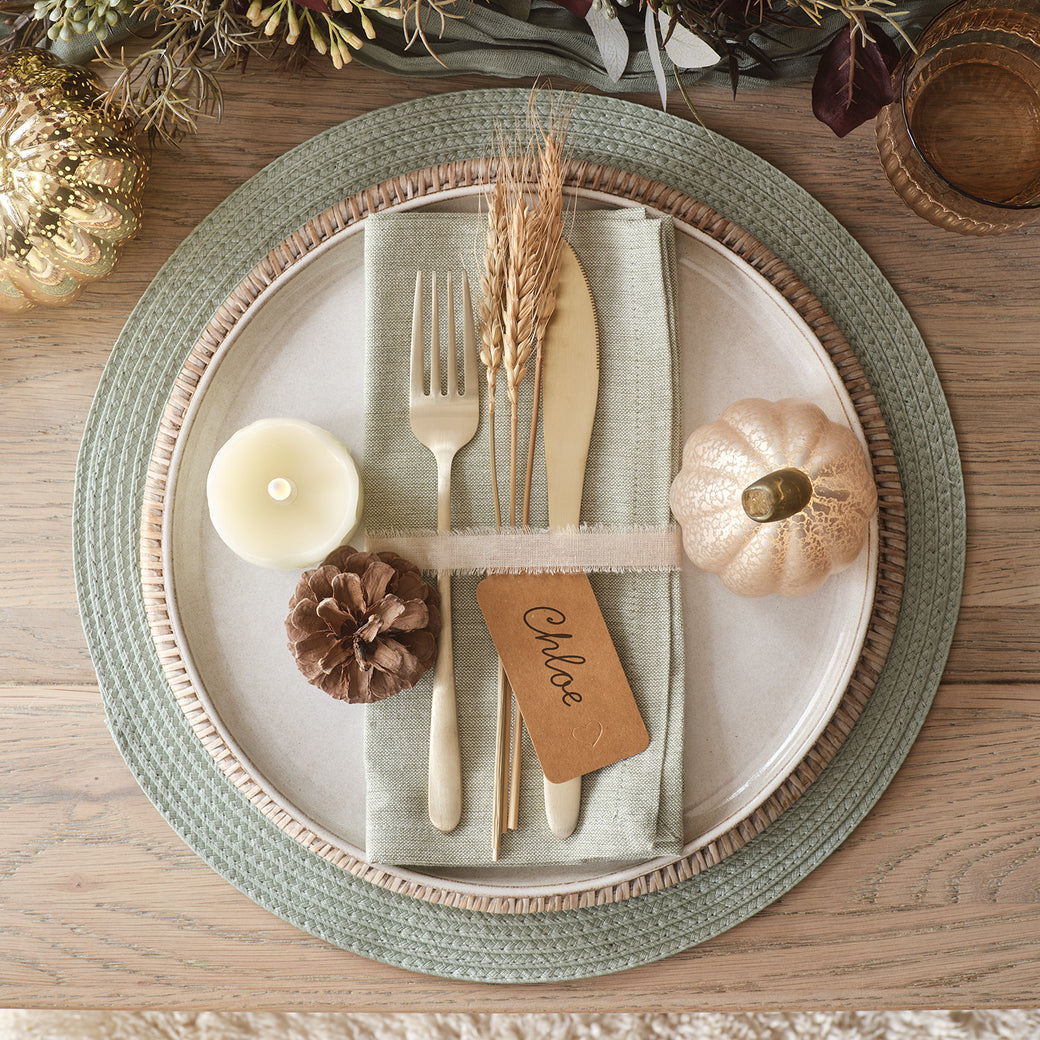 Continue the calming colour scheme with your crockery. We’re loving simple stoneware this year: natural, neutral, and endlessly restyle-able. Add your napkins, cutlery, and then get creative with ribbons and foraged treasures like pinecones to create a bespoke place setting for every diner. Add a miniature light up pumpkin or an LED tea light to bring a little glow to your plates, and finish with a craft paper name tag to help your guests find their seats.