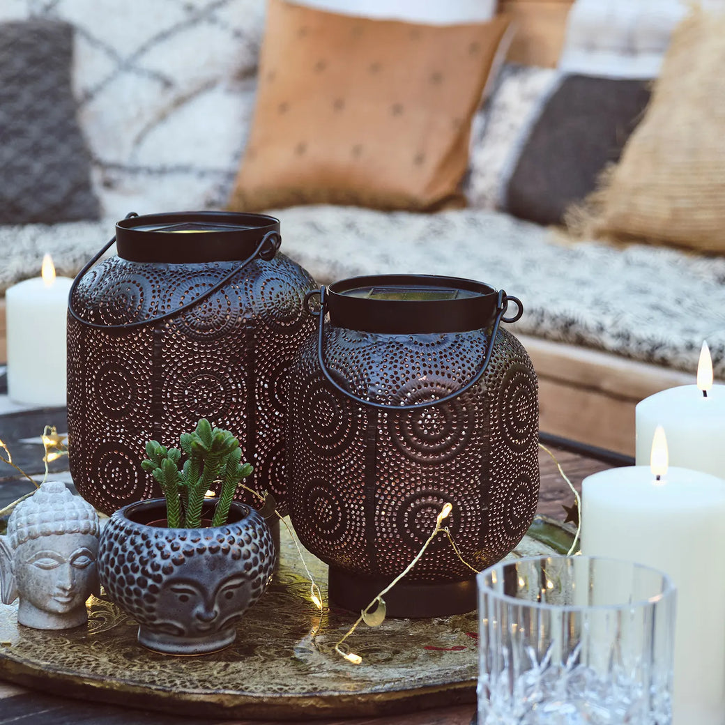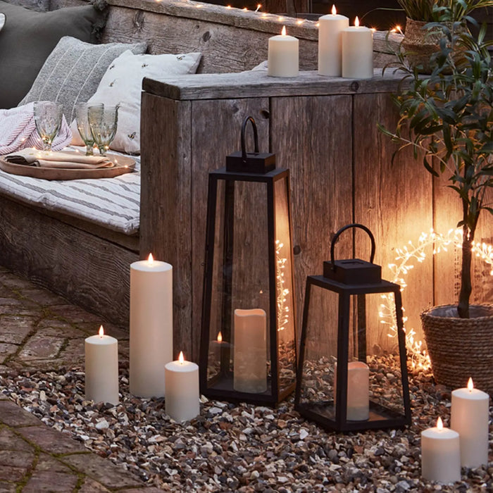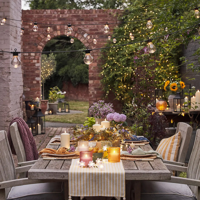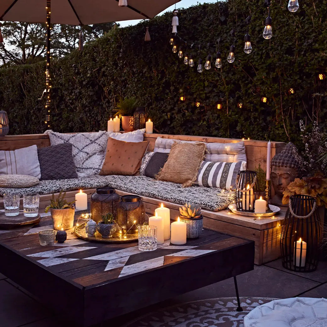 No matter the size of your garden you can always use lights to create the illusion of a bigger space. Adding lights at all three height levels is a great way to open up your space by drawing your eyes to all the garden surroundings rather than just focusing on one level specifically. Fairy Lights and festoon lights are perfect choices for brightening up high, whilst candles, and outdoor lanterns will add a soft sparkle to your tables and around seating areas lower down.