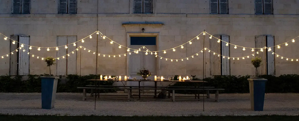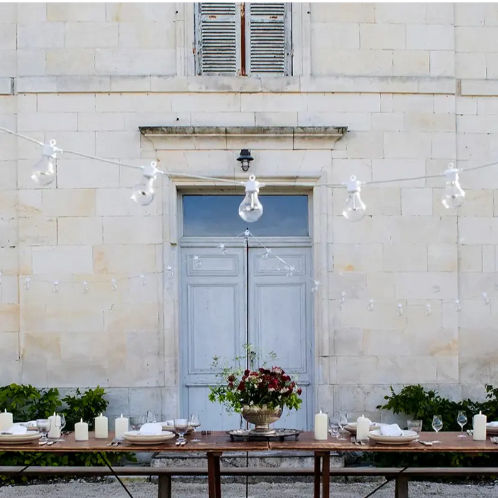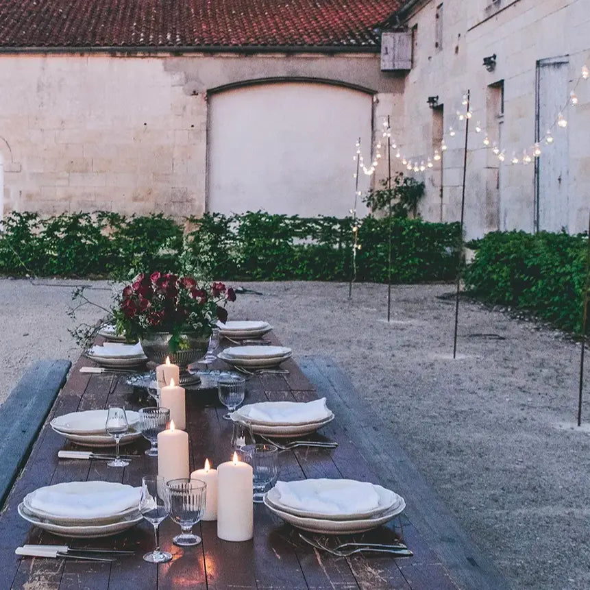 By night, there’s no better way to dress a wedding venue than with festoons and wedding candles, La Cannonerie have done this beautifully. With festoons swagged up high, they create a magical feel above guests and light up the after party with a warm glow to carry you and your guests well into the night. Our TruGlow candles dress tables perfectly, from taper candles and pillar candles line tables and entwine around foliage & place settings, they’re the perfect pair for lighting up event spaces.