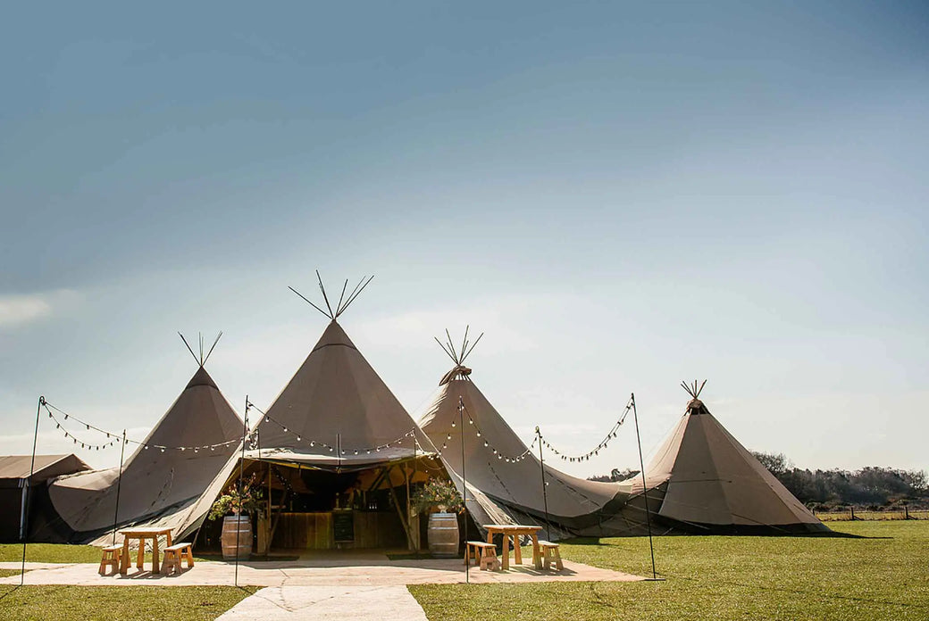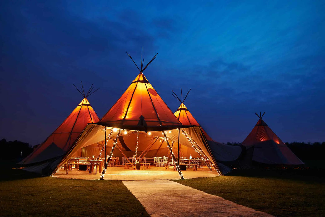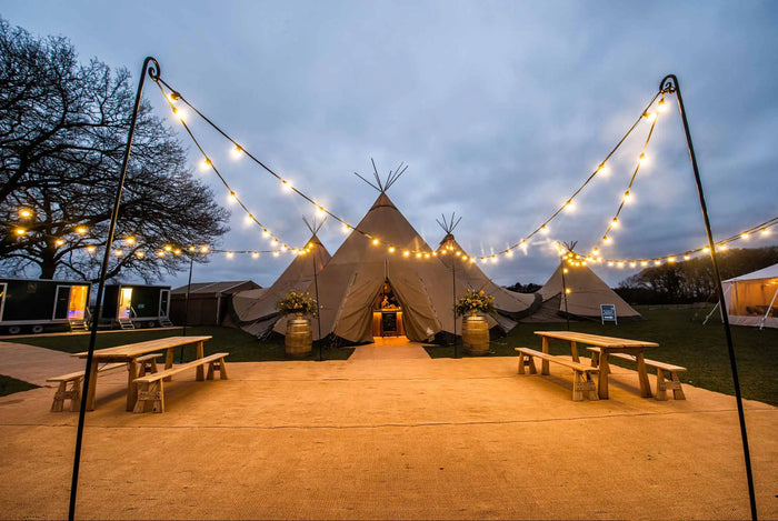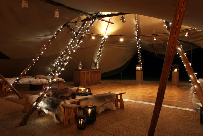 Marquees or tipis with timber beams offer the perfect spot for a sprinkle of marquee lights. Your marquee hire company may already have a package for these, however do ensure their standard up-lighters are not placed in the same location. Your lights will sparkle more in a low level light. Natural, amber and warm white lighting is the most flattering and creates a romantic, soft lighting effect more suited to a wedding. We suggest using the features already at your disposal and using the beams and pillars to twist or line fairy lights up. Weather depending we would advise opening one side of your marquee or opening the side flaps of the tipi to let in as much natural light as possible.