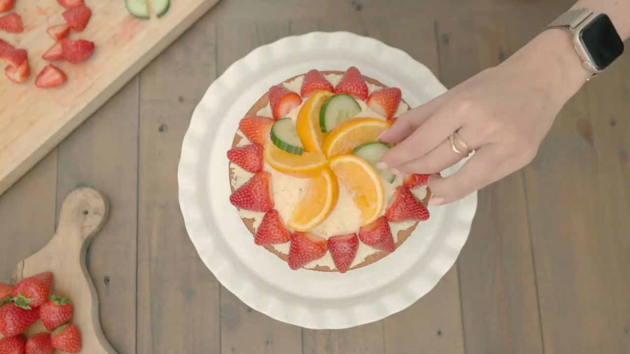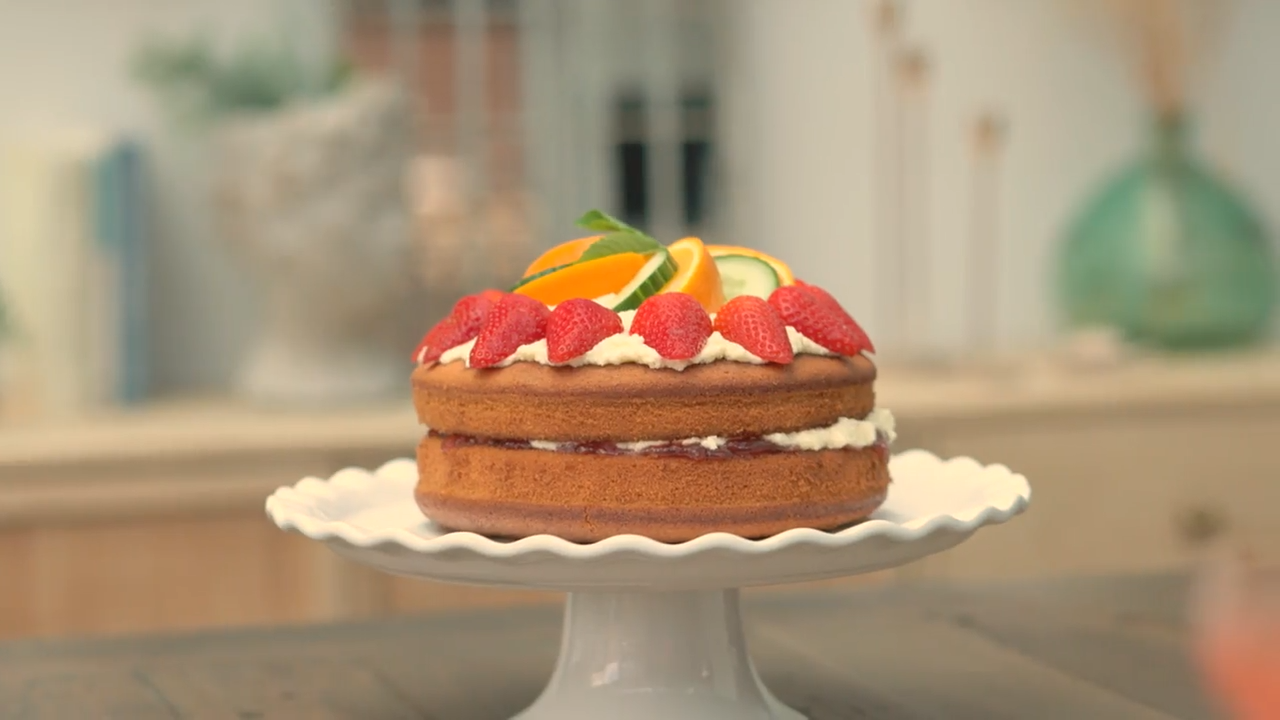 Decorate the top of your Victoria sponge with cream, slices of strawberries, cucumber, orange segments, and a handful of fresh mint leaves, just like a classic jug of Pimm's!