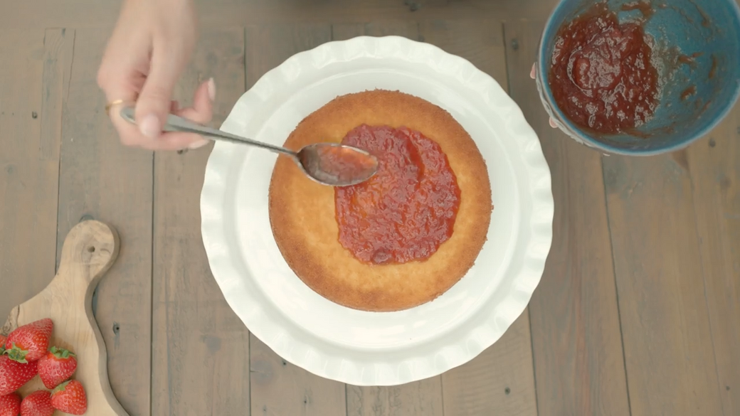In a bowl, whip the double cream, Pimm's, and icing sugar together until soft peaks form. This will be the filling for your cake, along with some strawberry jam (home-made optional!). Once the cakes are completely cooled, spread a generous layer of strawberry jam over one of the cakes. Add a thick layer of Pimm's whipped cream on top, then sandwich with the second cake layer.
