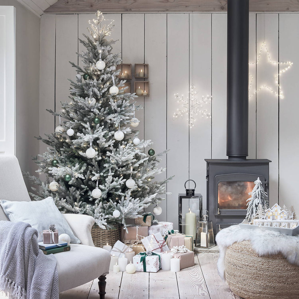 When implementing Scandi influences into your Christmas décor, flocked Christmas trees are the best way to bring the outdoors in and brighten up your space, as their snowy appearance is reminiscent of crisp winter mornings. White Christmas decorations like wooden advent calendars seamlessly blend natural textures with a minimalist finish for a traditional Scandi decoration. Pair your white décor with soft furnishings and accessories such as brown wicker tree skirts or cosy throws and rugs to add cosiness and comfort to your home this Christmas.