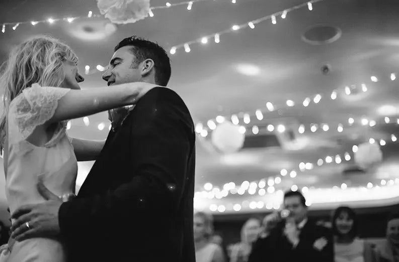 Sally and Andrew’s wedding is a great example of how fairy lights can totally transform a wedding venue. Strung back and forth across the ceiling, the warm white bulbs give a magic, nostalgic feel beautifully in keeping with the bride’s dress, the table settings, the cake table and the rest of the décor. Out-of-focus fairy lights are also a gorgeous photo backdrop, and a canopy like this will make your first dance so much more special.