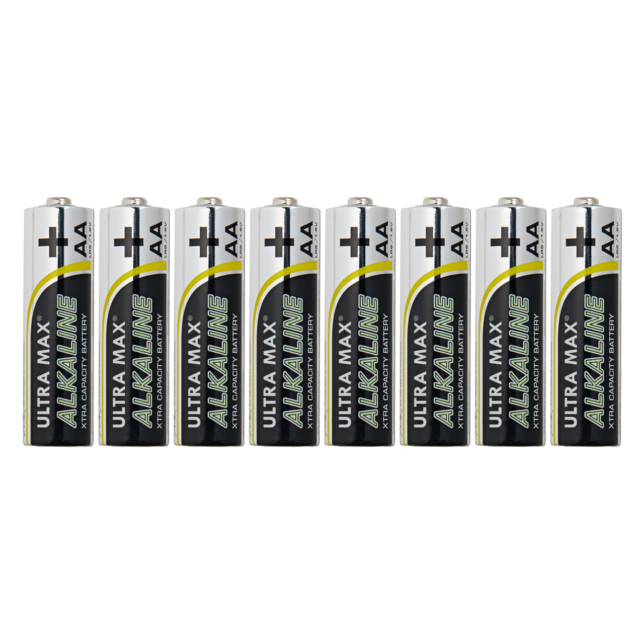Pack of 8 alkaline batteries, size AA. These 1.5V batteries fit many of our battery powered fairy lights and candles - check the 'additional information' section on product pages to see which batteries your lights require.