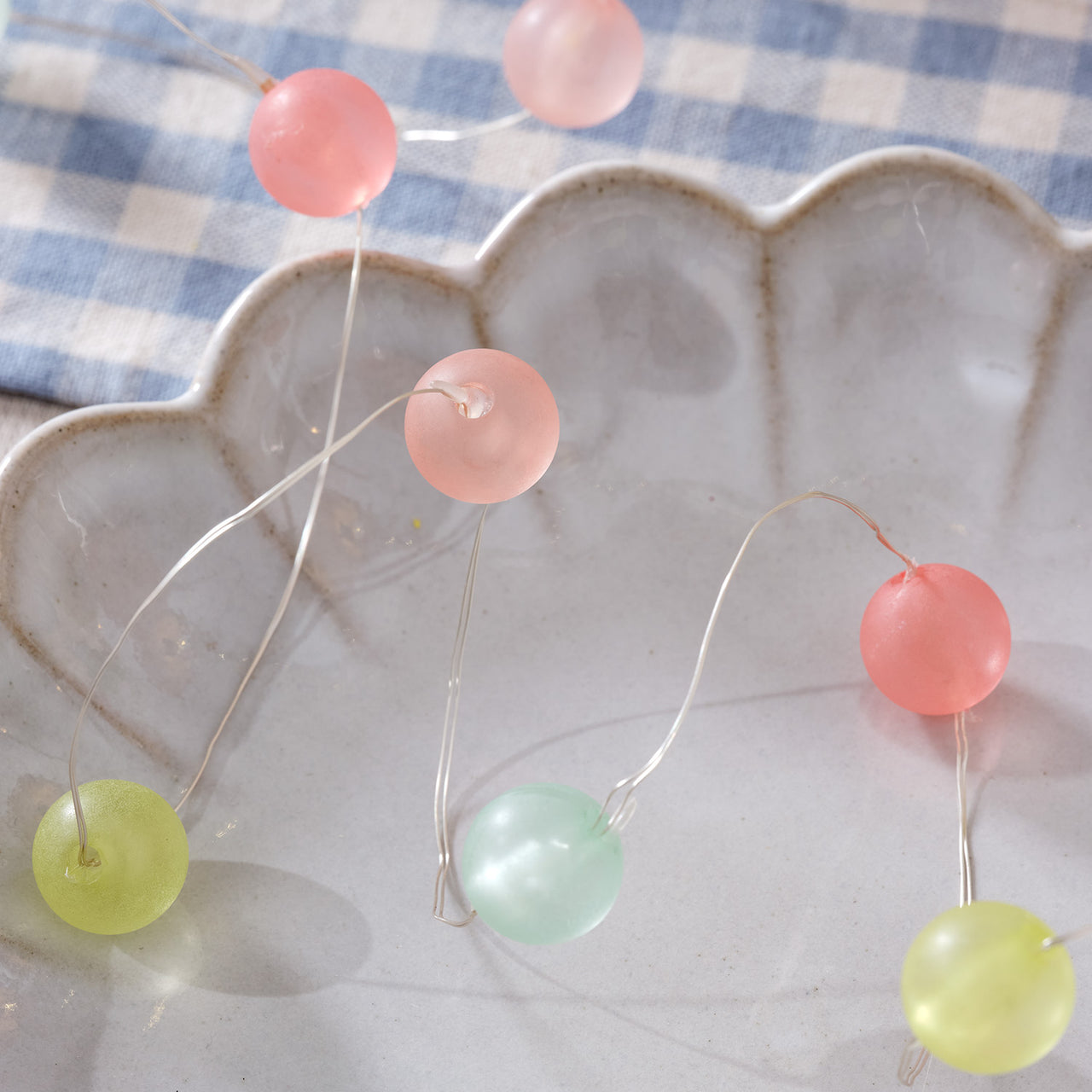 30 DAY RETURNSBring some candy-coloured fun to your spring decorations with our pretty and versatile Pastel Ball Micro Lights. A set of 20 matte effect baubles in pastel colours are spaced here along a delicate 190cm silver wire. Each ball is lit with a warm white LED micro light, so that, when illuminated, the baubles transform into a strand of glowing, jewel toned lights.