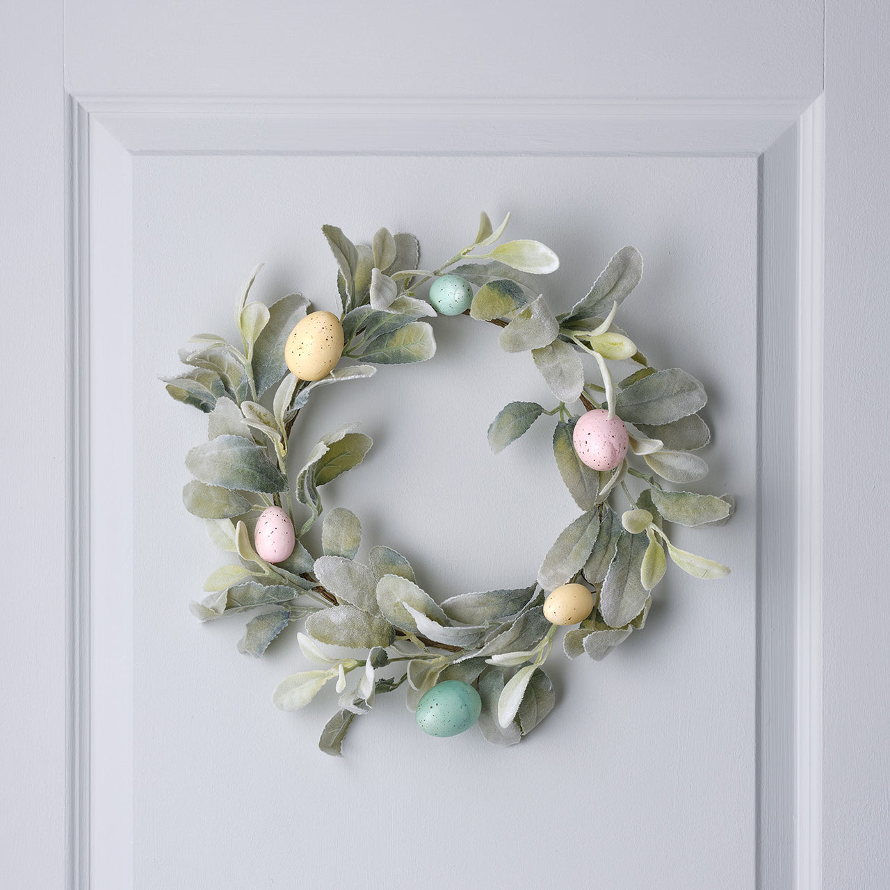 Bring a cheerful note to your Easter celebrations with our pretty seasonal wreath. At 40cm across, this wreath features a slender wireframe woven about with soft faux foliage, amongst which nestle six speckled eggs in soft pastel tones.