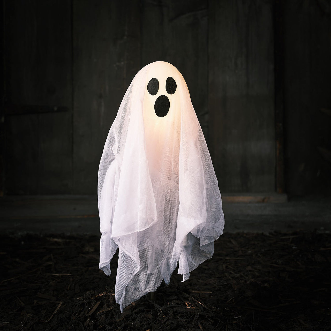30 DAY RETURNSBring some ghoulish vibes to your outdoor space with our Spook the Ghost figure. A single LED bulb lights up the frightful face and a classic ghostly white sheet covers a single plastic stake which can be planted into the ground to secure the ghost outside, making for a fun and chilling addition to your decorative scheme. Place this ghoul in the front garden, where the shiver of his fabric sheet is sure to give passers-by a little scare or pop him into a plant pot and add fresh pumpkins and rattan spiders to give your back yard a spine-tingling seasonal makeover.