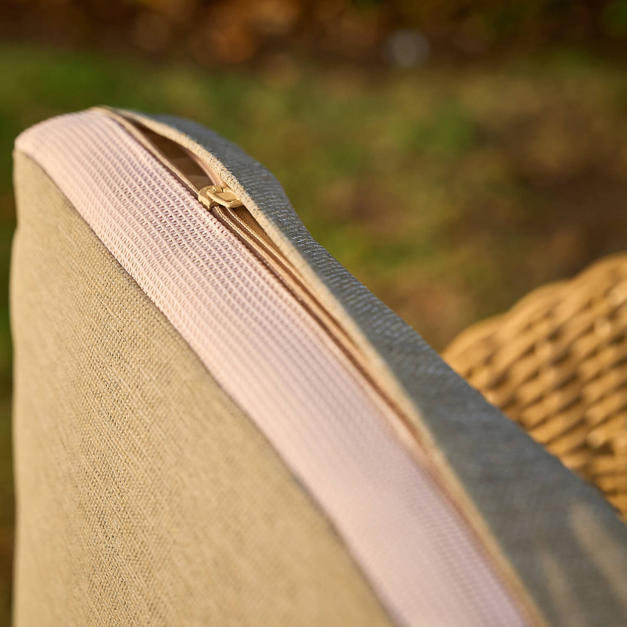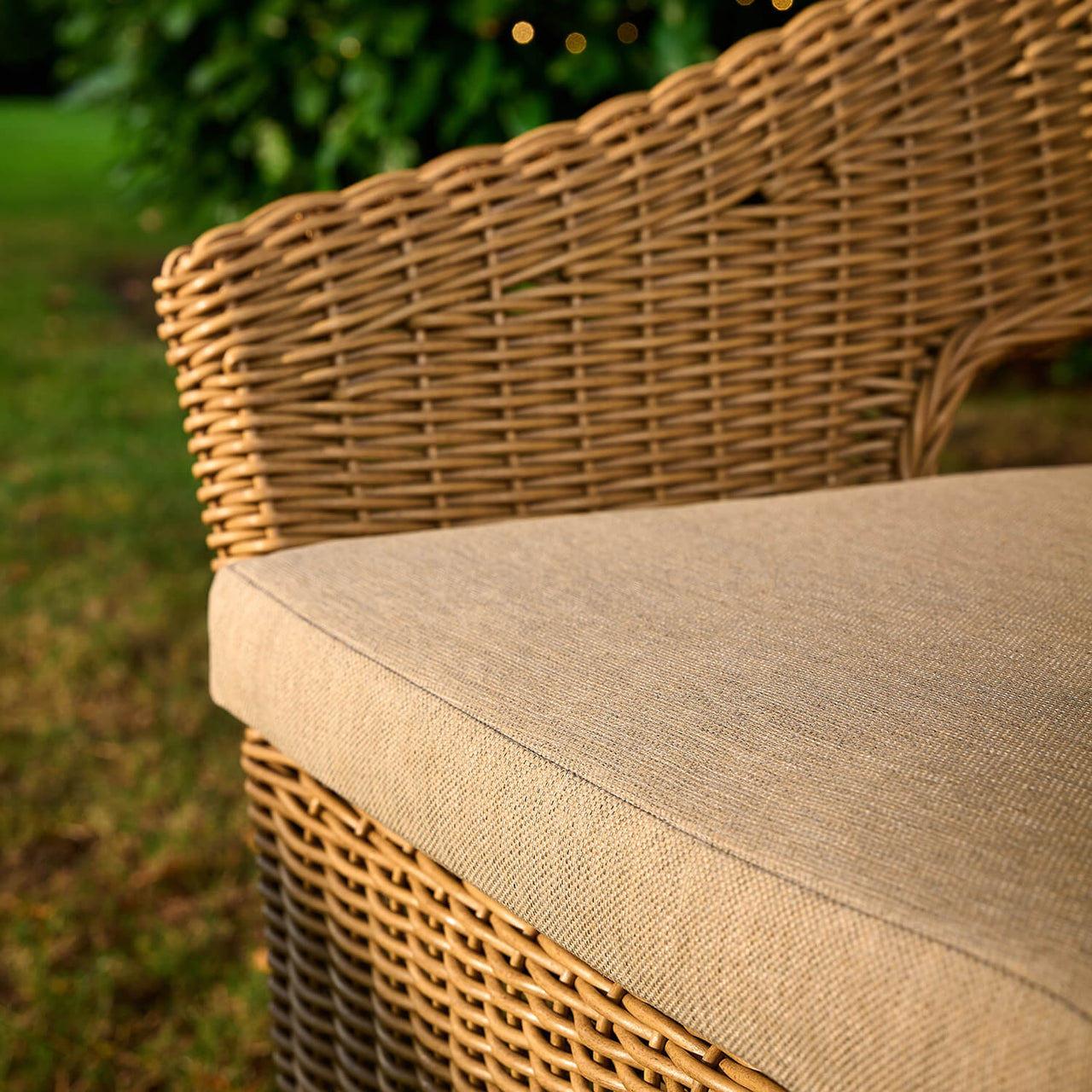 The two chairs and the accompanying sweet round side table are all crafted from 100% all-weather rattan in a warm caramel colour, with additional patterns incorporated into the backrests of the chairs to really show off the material to its fullest. The rattan is handwoven over durable and rust-proof frames, which offer protection from the elements. The seats of the chairs come complete with a water-resistant, detachable and high-quality olefin fabric cushion in a stylish cream shade.