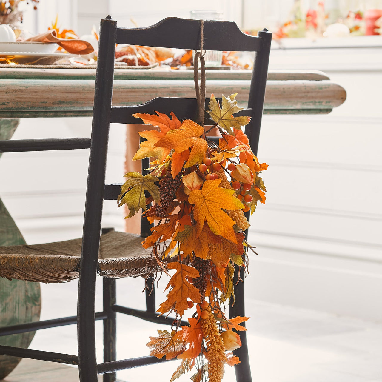 Our elegant autumn bough has been delicately handcrafted in colours of the autumn season. Transform doors in your home, creating an inviting and cosy autumn space filled with vibrant colours. Made from faux foliage and artificial berries in orange, red and green, you can display all season long and for years to come. At a height of 70cm, it will make a lovely addition to the back of chairs for autumn dinner parties with friends and family. The hanging loop allows for easy display on walls inside your home, perfect for adding autumnal finishing touches. Carefully weave micro lights (sold separately) within the foliage for a subtle seasonal sparkle.