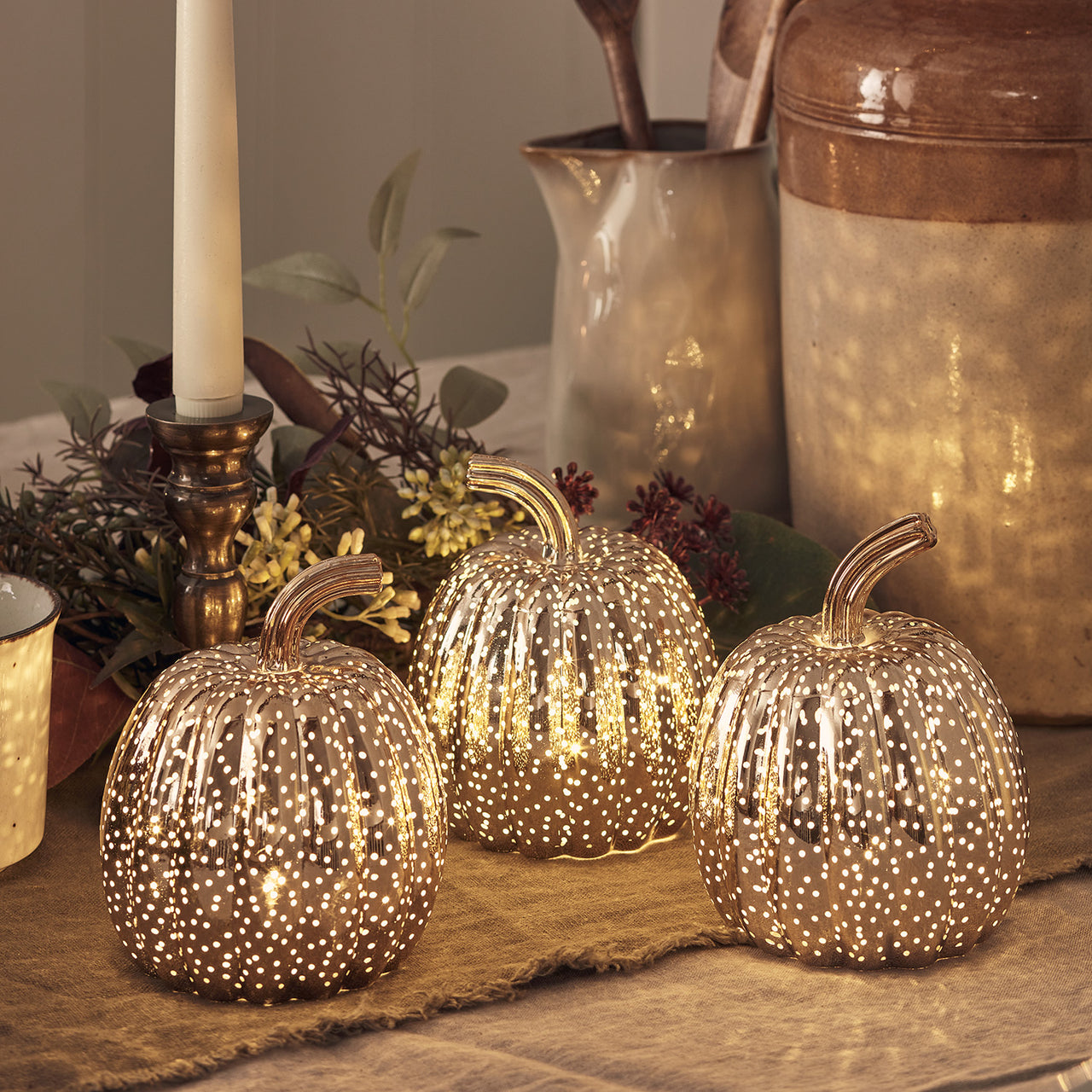 Our super cute mini pumpkins are sure to add a seasonal glow to your home! Crafted from lightweight glass and complete with a mottled brass finish, they are each unique in their design. The set of 3 pumpkins look great teamed with green foliage and micro lights to create a showstopping autumn table centrepiece. Housing 1 warm white LED within each pumpkin, they’re super easy to use by popping 3 x AAA batteries in and setting the optional timer to illuminate night after night.