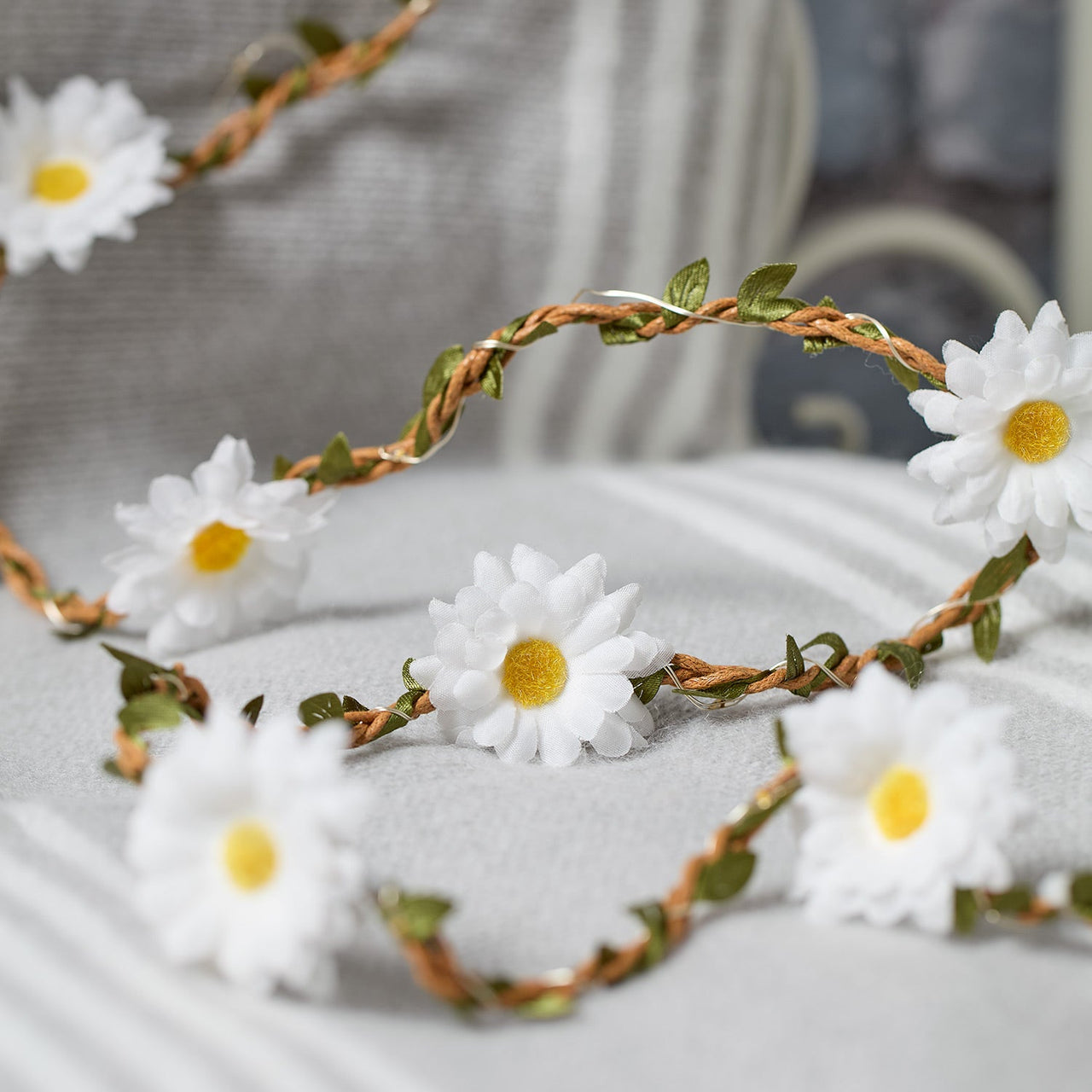 Make Easter bright and beautiful with our illuminated daisy garland, intertwined with dark green leaves and Micro LEDs. Swag them from springtime shelving; drape them over a mantelpiece; entwine them around a chandelier – wow your guests with flowers! For illumination, simply pop 3 x AA batteries into the battery pack, and for extra convenience, the optional timer turns them on for 6 hours each evening.