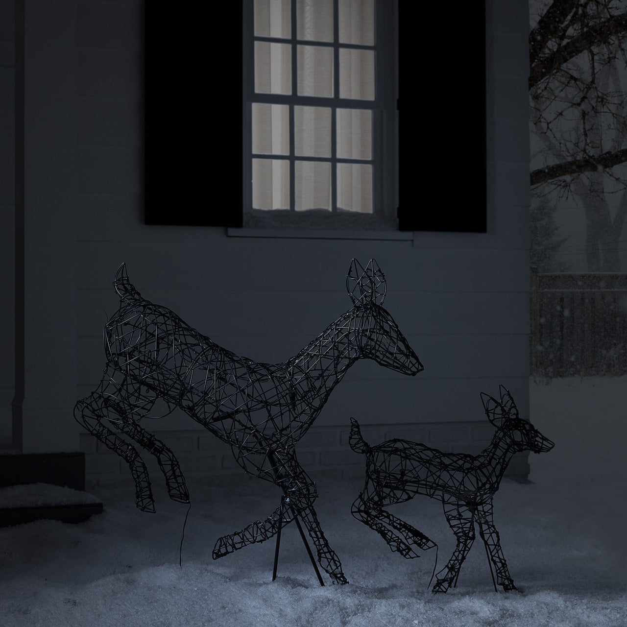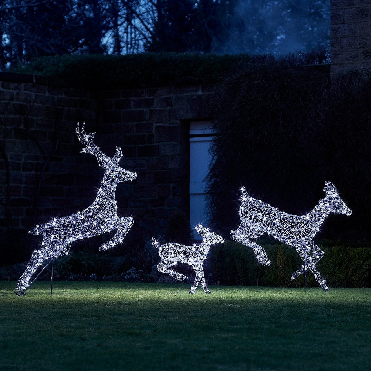 Experience a magical feeling this festive season with our Harlow Doe and Fawn. Designed in house from studying real does and fawns, every detail of this pair has been intricately made to mimic the real animals, from their 3D ears to the elegantly landing post leap. The handmade frame is wrapped with grey faux rattan and illuminated by 200 and 100 hand placed LEDs, for a sparkling and waterproof festive finish. Our Harlow reindeer range features new innovative technology, which gives you the choice of illuminating your deer in 3 different shades, from icy white to warm white. This exclusive dual colour design and functionality allows you to have consistency with existing displays or you can change up your style throughout the season! Each figure has a handy 8m lead cable from the plug to allow you to position them in the perfect place, and the 6 hour timer means they’ll magically illuminate at the same time each evening. Complete the look by pairing with our Harlow Stag for the ultimate festive family display!