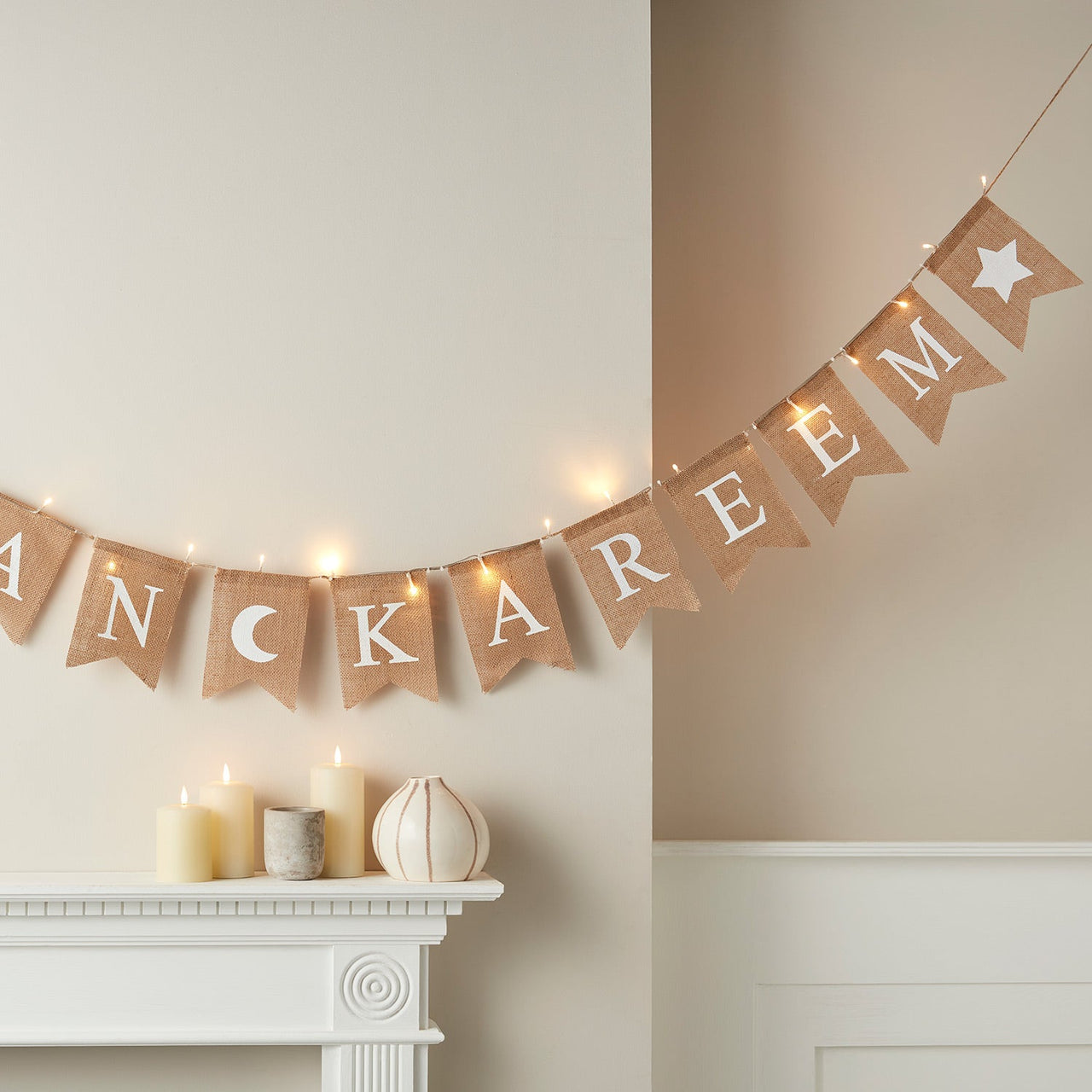 Welcome Eid with our ‘Ramadan Kareem’ bunting! Featuring 15 hessian flags and 25 warm white LEDs across a 2.5m clear cable, this bunting looks great draped in windows, hung from mantles or between walls for both day and night time celebrations. Simply pop in 3 x AA batteries into the battery box and use the handy 6 hour timer for effortless illumination each night.
