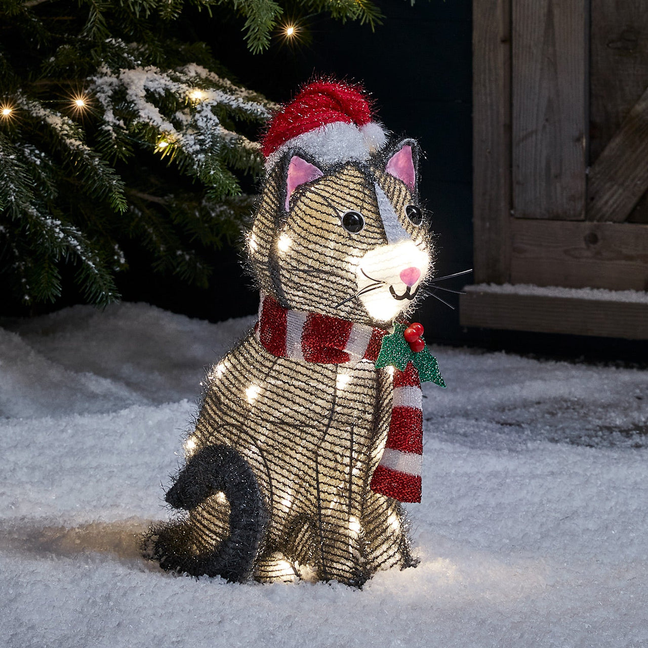 Our cute Christmas cat is a paws-itively adorable feature for sitting in your garden this festive season! At 46cm tall and made from tinsel fabric, this feline friend is illuminated by 30 warm white LEDs to bring her to life by night! To keep your figure looking its best, style on covered outdoor patios or porches throughout the winter season or bring indoors during bad or rainy weather to enjoy inside your home. Simply plug in and set to the handy timer for automatic illumination at the same time each evening.