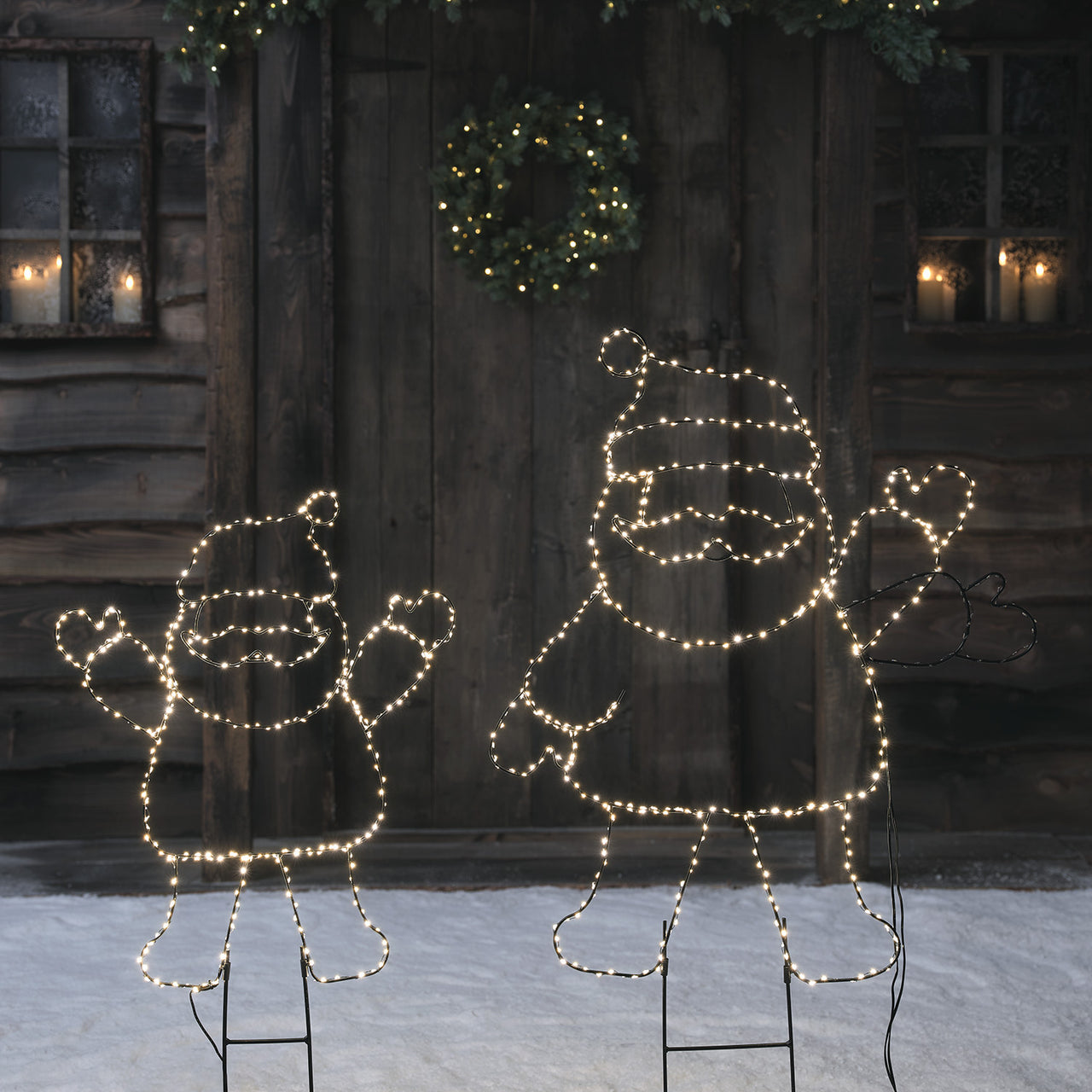Bring double the fun to your festive garden display with our set of 2 Santa Claus Outline Stake Lights. Both metal Santa Claus silhouettes are set on H shaped stakes and wrapped with micro LED bulbs set onto a delicate silver wire. The first Santa stake light measures 57cm and features 240 warm white lights. The second figure is 77cm high and is dotted with 490 warm white lights. When switched on, the lights on this sihouette flash between the two right arm outlines so that Santa appears to be waving! This delightful pair are perfect for decorating smaller outdoor spaces, so pop them into a planter on a balcony or outside the front door where they can greet passers-by or neighbours with a touch of festive sparkle on winter evenings.