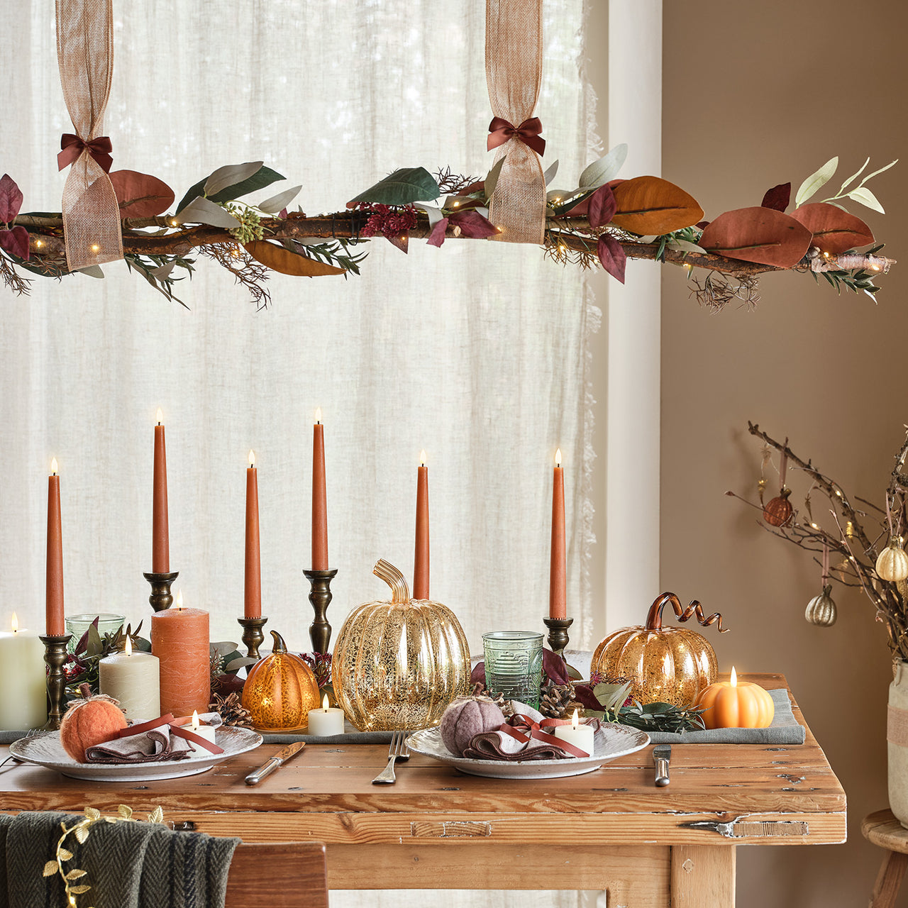 Bring a cosy note to your autumn décor with our set of four felt pumpkin table decorations. The earthy colour palette of gentle seasonal hues reflects the changing shades outdoors, and the little hessian bows add a natural accent to pieces. These soft pumpkins look perfect nestled amongst fall foliage with some TruGlow® mini votive candles for a unique centrepiece. Alternatively, pop one at each place setting for a whimsical addition to your fall table.