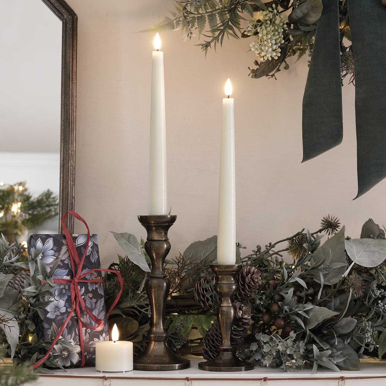 Our stylish set of ivory taper candles are sure to warm up your interior! Perfect for styling as part of a table display or adding a cosy look to your living room, they are an elegant addition to any space. Made from real wax and featuring innovative technology, the LED flames have a "just-lit" effect to create an authentic glow. Simply pop the batteries into the base of each candle and set to the handy timer function for automatic glow each day or use the remote control included for effortless illumination!