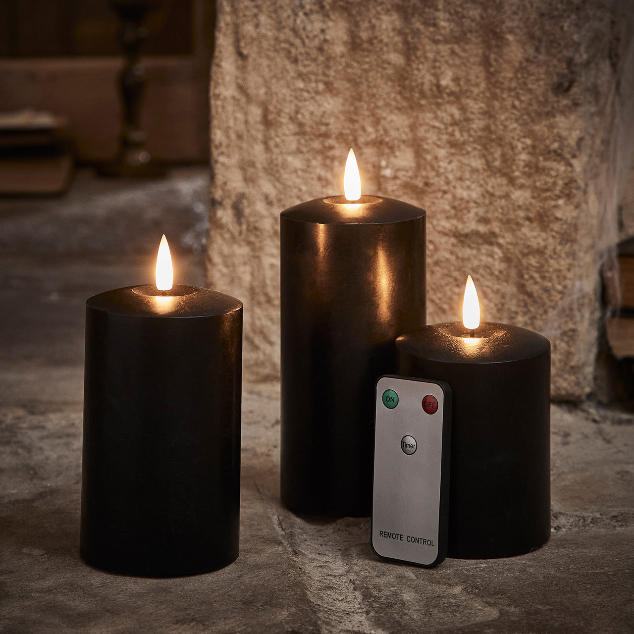 Invite an eerie yet elegant ambience into your home with our trio of black TruGlow® pillar candles. At 15, 12.5 and 10cm in height, they’re great for styling on your mantel or side tables for a spooky and stylish glow. Made from real wax and with a ‘just lit’ appearance, these realistic candles feature an LED flickering flame that will stay cool to the touch, for a super safe alternative to the real candles. Simply pop 2 x AA batteries into the base of each candle and use the optional 6 hour timer function for a haunting glow at the same time each night.