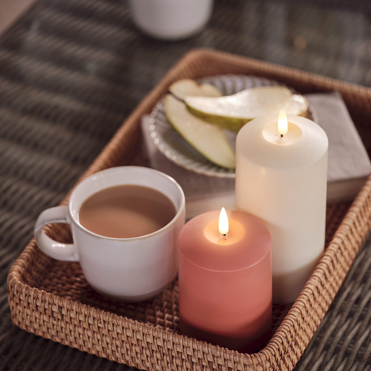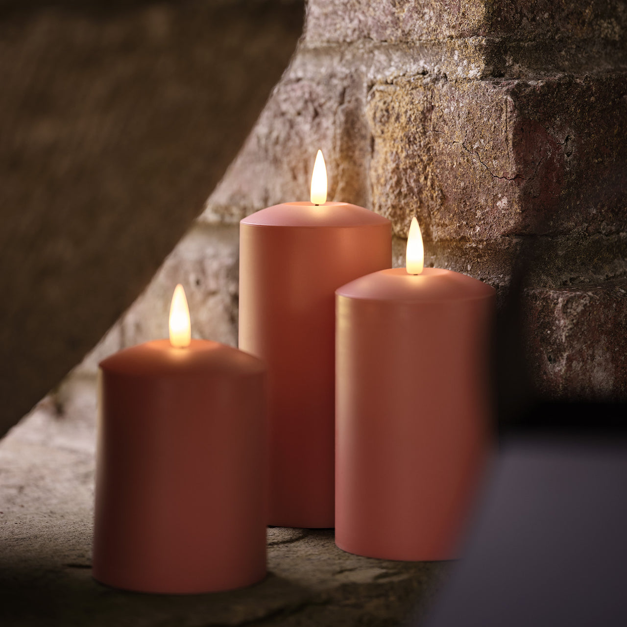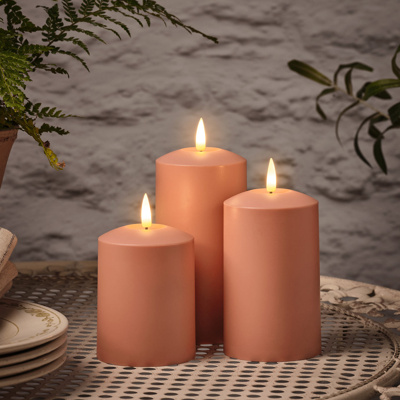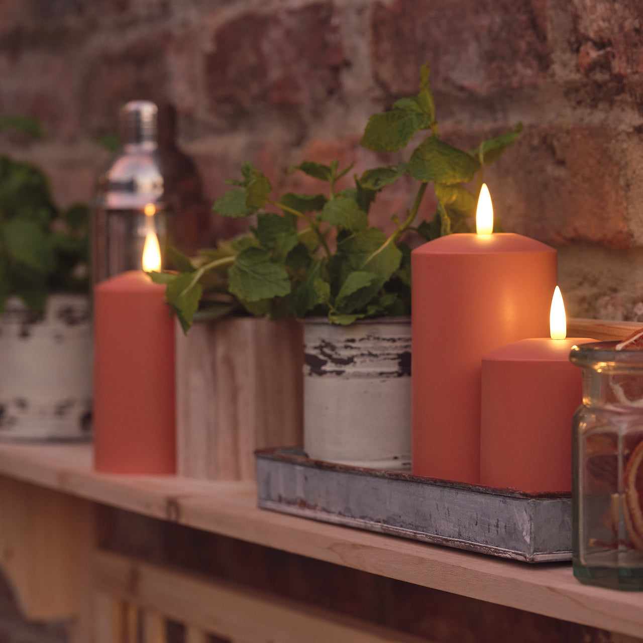 Bring a touch of the Mediterranean to your garden this summer with our set of 3 Outdoor Battery Operated TruGlow® Candles. Carefully crafted from weatherproof plastic in a stylish terracotta shade, this trio of candles will add an elegant note to any garden display. Standing at 15cm, 12.5 and 10cm tall, with 7.5cm diameter bases, each of these candles is topped with a realistic flickering LED flame in a warm white shade to create a luminous glow.