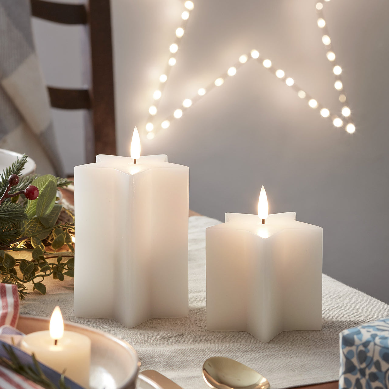 Add a Christmassy feel to your home this winter with our TruGlow® star candles. At 12 and 8cm in height, this duo is made from hand poured real white wax in the shape of stars, which are as close to the real thing as you can get! Each candle features an LED flickering flame that will stay cool to the touch, so you can enjoy a candlelit glow with complete peace of mind. Perfect for the festive season or all year round, style on your mantlepiece or side tables to fill your home with a soft shine. To use, simply pop 2 x AA batteries into the base of each candle and choose the optional 6 hour timer function for an automatic glow at the same time each night.