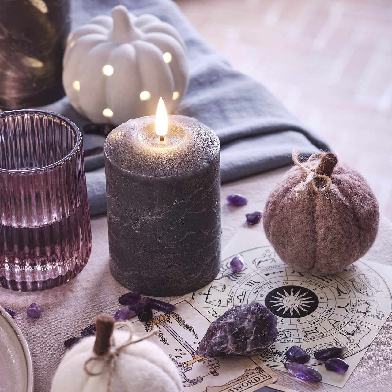 Add a contemporary look to your home with our TruGlow® pillar candles. With a dark grey distressed finish, they’re the perfect accessory! Combining hand poured real wax and innovative technology, our trio of candles have a ‘just lit’ look and mimics the appearance of a real flame. With varying heights of 10, 12.5 and 15cm, simply pop 2 x AA batteries into the battery box and use the 6 hour timer to add a cosy glow to your home, completely fuss free.